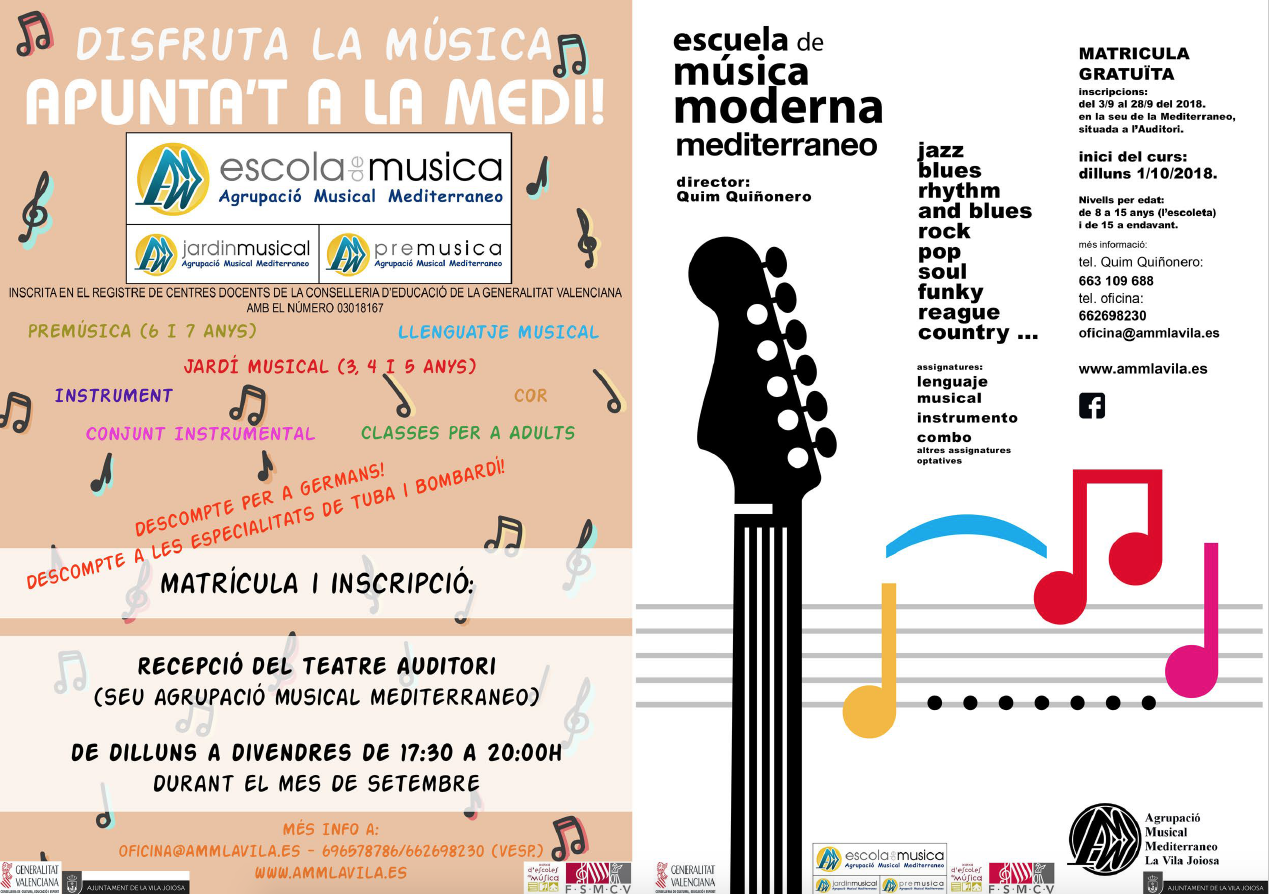 A partir del día 3 de Septiembre de 2018 yhasta el 28 del mismo mes se podrá realizar la matrícula e inscripción. de lunes a viernes en horario de 17:30h a 20:00h, en la recepción del Teatre Auditori de La Vila Joiosa (sede de la Agruapció Musical Mediterraneo).